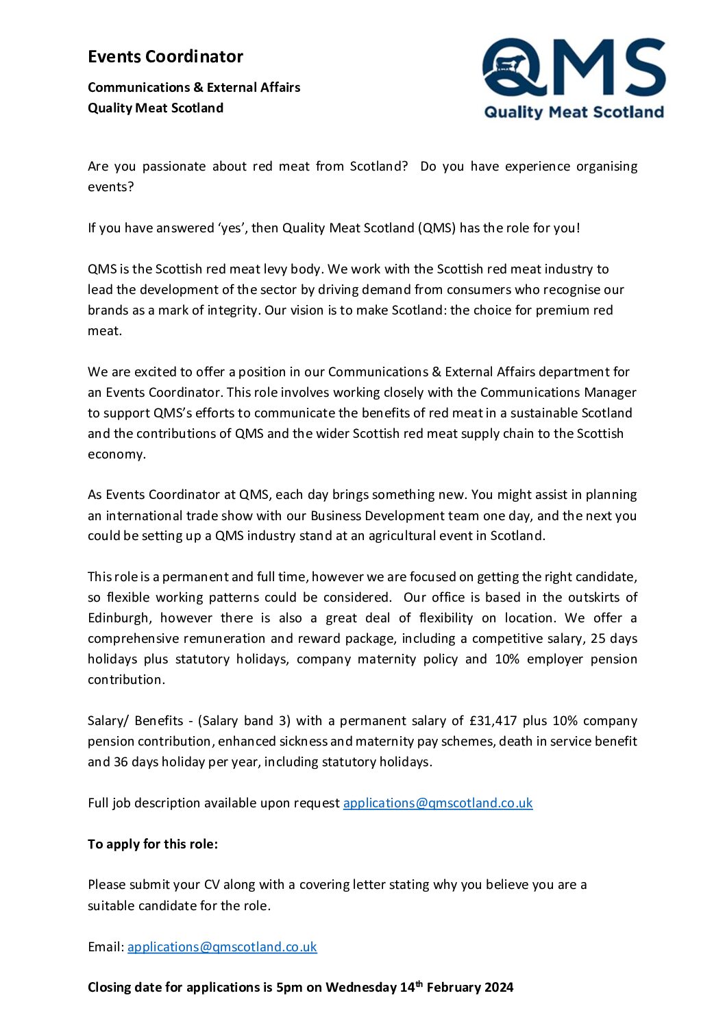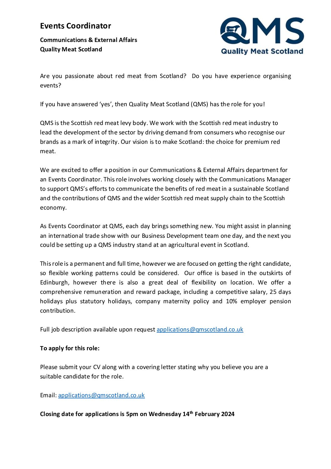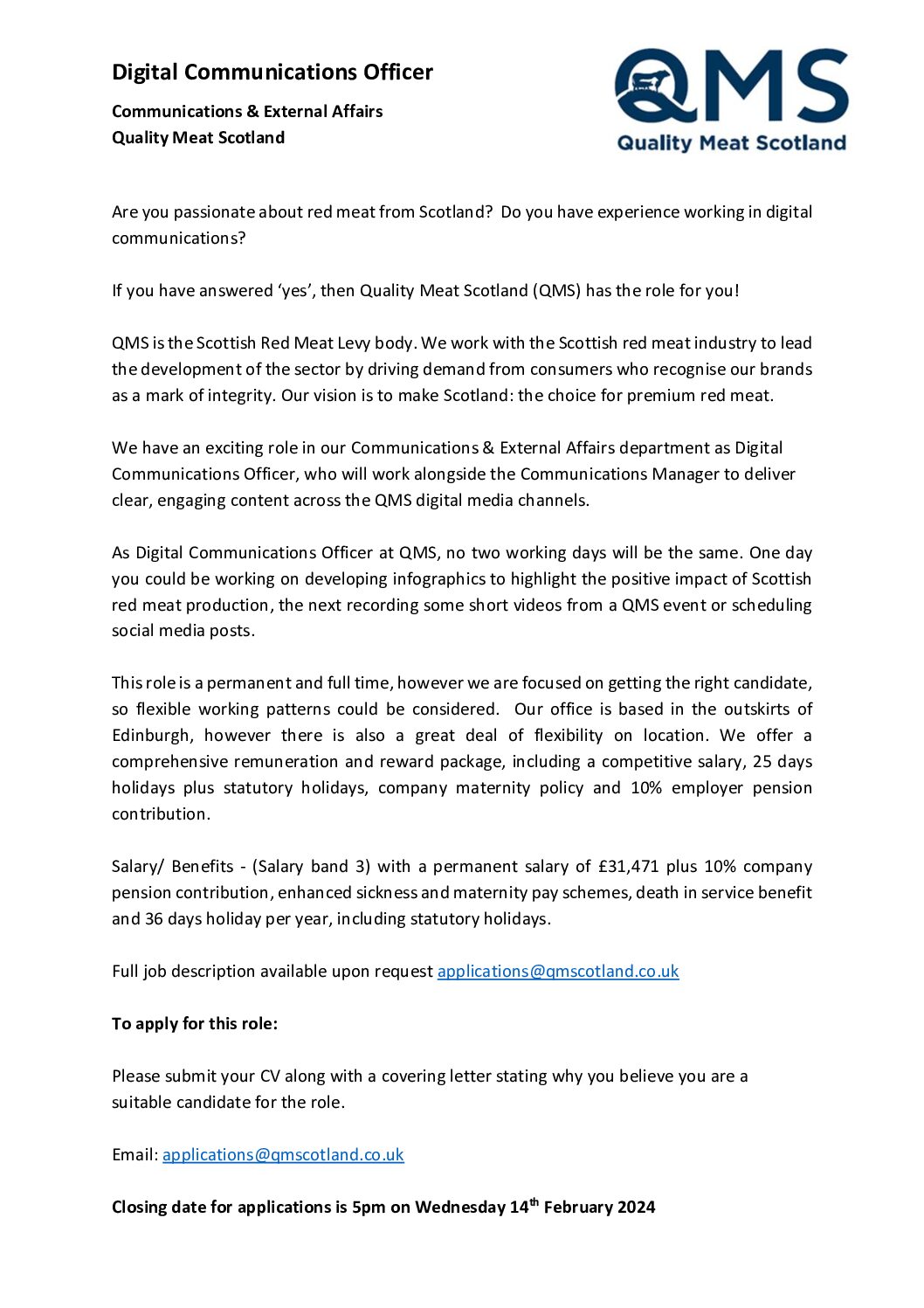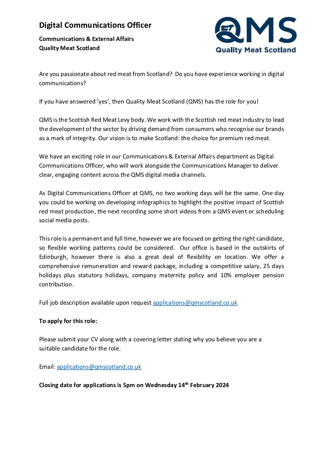 News & Resources QMS Publications News & Resources Documents Search Looking Glass Document Type All Document Types Board Minutes & Papers Briefing Fact Sheets Market Updates Publications Standards Template Tenders Toolkits Category All Categories Annual Review Business Plan Consumer Insights Report Exports Industry Livestock + Market Report Market Update The Cut – Magazine View Save PDF QMS Job Advert Health and Education Co ordinator View Save PDF 20240126 QMS Events Coordinator Job Advert View Save PDF 20250317 QMS Job Advert Community Engagement Coordinator NS View Save PDF 20240126 QMS Events Coordinator Job Advert NS View Save PDF 20240126 Digital Communications Officer QMS Job Advert View Save PDF 20240126 Digital Communications Officer QMS Job Advert NS View Save PDF 20231010 QMS Health Education Coordinator Advert NS View Save PDF QMS Job Advert: Director of Business Development View Save PDF 20230208 QMS Job Advert Director of Marketing NS View Save PDF 20230208 QMS Job Advert Director of Business Development NS View Save PDF St Andrews Factsheet View Save PDF QMS Veganuary Unwrapped 2021 1 of 55 1 2 … 55 Next